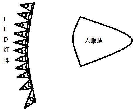 為了解決由于距離近無(wú)法看清圖像的問(wèn)題,我利用用凸透鏡把每個(gè)LED燈的光線都由發(fā)散光聚焦,但并不是聚焦為平行光,而是仍略有發(fā)散,使人眼能夠看清圖像。這樣做的目的是防止不同使用者戴眼鏡位置不同而可能發(fā)生的看不清圖像的問(wèn)題。如圖: