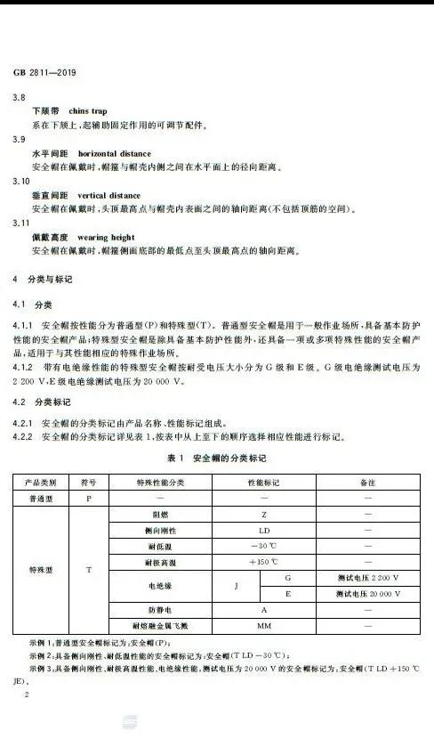 · 修改了標(biāo)準(zhǔn)適用范圍 · 修改了部分術(shù)語和定義的措辭,并刪除了部分術(shù)語 · 增加了安全帽的分類 · 修改了對(duì)于安全帽質(zhì)量的要求 · 修改了對(duì)于佩戴高度的要求 · 修改了對(duì)于通氣孔的要求 · 修改了對(duì)于耐低溫性能的要求 · 增加了對(duì)于耐極高溫性能的要求 · 修改了對(duì)于電絕緣性能的要求 · 修改了對(duì)于防靜電性能的要求 · 增加了對(duì)于耐熔融金屬飛濺性能的要求 · 修改了對(duì)于安全帽永久標(biāo)識(shí)的要求 新版的GB2811-2019規(guī)定,在安全帽內(nèi)側(cè),全生命周期內(nèi)必須清晰保持以下6項(xiàng)標(biāo)識(shí): a)本標(biāo)準(zhǔn)編號(hào); b)制造廠名; c)生產(chǎn)日期(年、月); d)產(chǎn)品名稱(由生產(chǎn)廠命名); e)產(chǎn)品的分類標(biāo)記; f)產(chǎn)品的強(qiáng)制報(bào)廢期限。 原文如下: