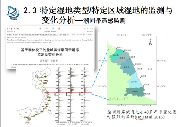 特定濕地類型的監(jiān)測(cè)與變化分析,為什么最近在做特定類型呢?我們發(fā)現(xiàn)監(jiān)測(cè)濕地變化呢,從無(wú)到有,從原來(lái)不了解,研究了之后發(fā)現(xiàn)我們很多數(shù)據(jù)不足,包括其中很多類型沒有監(jiān)測(cè)到,包括水田用其他的方法補(bǔ)充進(jìn)去了。因?yàn)楹Q鬂q潮的時(shí)候衛(wèi)星每天時(shí)間大概早上5點(diǎn)過(guò)境,但是沒法監(jiān)測(cè)潮間帶,所以我們對(duì)潮間帶做了監(jiān)測(cè)。