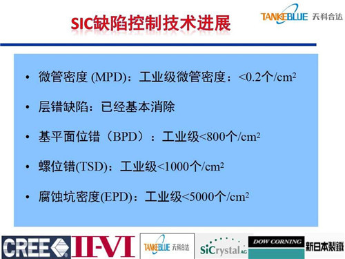 目前工業(yè)級碳化硅襯底微管密度小于0.2個/cm2,層錯缺陷基本消除,基平面位錯工業(yè)級襯底小于800個/cm2。經(jīng)預測,2019年碳化硅襯底市場約為3.5億美金,主要包括電力電子和微波領域,加上LED等其他領域應用,大概為8億美金。