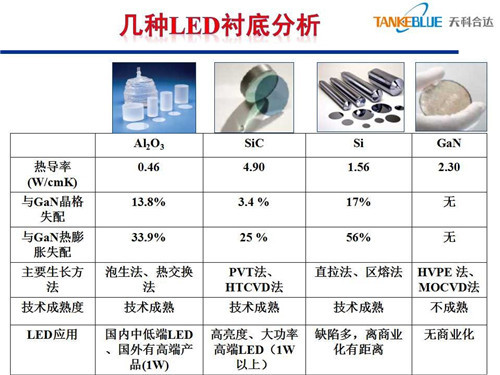 但是在這里面我們今天講的主要是藍寶石、碳化硅,剛才在講的時候我思考幾個問題,這幾個材料在發(fā)光效率上藍寶石可以做到150lm/W,碳化硅可以做到200lm/W,在發(fā)光效率上確實體現(xiàn)差異。在物理基礎參數(shù)上體現(xiàn)了差異,比如說跟氮化鎵外延,從晶格匹配上,碳化硅上長氮化鎵確實好一些,藍寶石失配大一些,直接影響外延的質(zhì)量。另外導電性、熱導率也是有差異的。