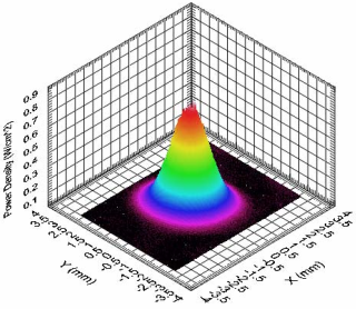 2013年10月,電子所實(shí)現(xiàn)了國(guó)內(nèi)首次DPAL銫激光輸出,激光輸出功率394mW,光光效率7.4%,實(shí)驗(yàn)光路如圖2-9所示。對(duì)各項(xiàng)參數(shù)進(jìn)一步優(yōu)化后,所得輸出激光具有極好的光束質(zhì)量,光束功率密度分布如圖2-10所示。激光器光束質(zhì)量M2因子接近1。實(shí)驗(yàn)證明了DPAL在光束質(zhì)量方面的潛力是極大的。
