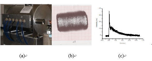 我們研制的高重復(fù)頻率TEA CO2激光器,如圖3-3(a)所示,輸出波長(zhǎng)10.6 μm,單脈沖能量可達(dá)15 J,重復(fù)頻率可達(dá)150 Hz,平均功率達(dá)到2250 W。圖3-3中(b)、(c)分別為該激光器的光斑形狀及脈沖波形。該激光器光斑形狀方正,能量分布均勻,并具有較高的峰值功率。