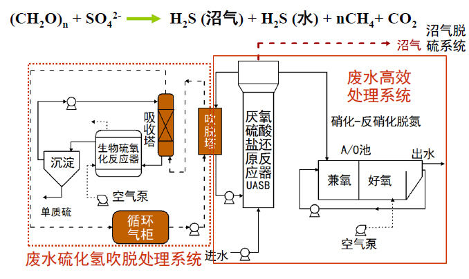 嗜鹽嗜堿微生物沼氣生物脫硫系統(tǒng)可廣泛適用于水解/酸化過程產(chǎn)生的含硫化氫氣體脫硫凈化處理以及單級厭氧系統(tǒng)產(chǎn)生的含硫化氫氣體脫硫;可有多種不同的厭氧生化反應(yīng)器形式及工藝組合;可促進廢水的反硝化脫氮過程和自養(yǎng)脫氮過程,實現(xiàn)硫資源的良性循環(huán)(圖2-8)。