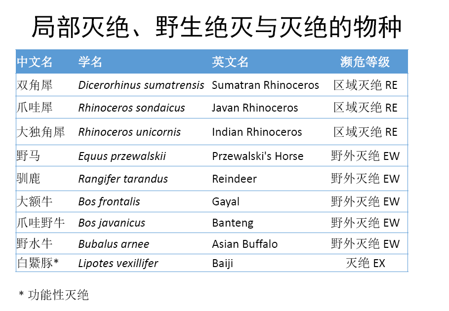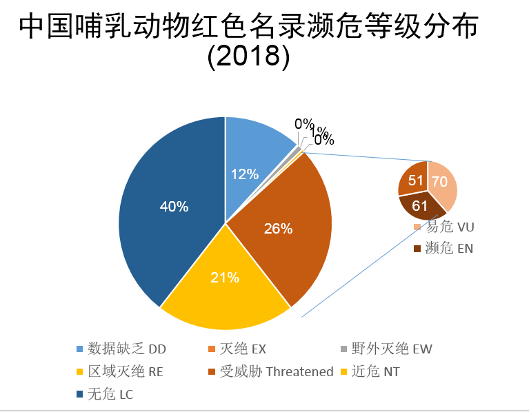 此外,我們對中國哺乳動物多樣性進行編目,分別于2015年和2017年完成了第一版和第二版,第一版中,我們收錄了673種哺乳動物,第二版中我們刪除了一些不存在的物種如倭巖羊,并增添了一些物種,主要是分布在藏南的一些物種,共收錄了693種哺乳動物,使得我國的哺乳動物總數位列全球首位。2015年發(fā)布《中國生物多樣性紅色名錄-脊椎動物卷》后,2018年又對該紅色名錄等級進行了更新,哺乳動物的情況來看,最新的評估結果中,受威脅的物種占26%、近危21%,無危40%,數據缺乏12%,其中有多個物種已經區(qū)域滅絕、野外滅絕或功能性滅絕。部分中國特有的哺乳動物,中國生物多樣性紅色名錄和IUCN紅色名錄的評估結果,由于評估信息的不同,結果也有所不同,如白鱀豚、長江江豚等;還有一些哺乳動物由于并非中國特有,所以中國生物多樣性紅色名錄和IUCN紅色名錄評估等級有所不同,如野馬、賽加羚羊、麋鹿、蒙原羚、河貍等。