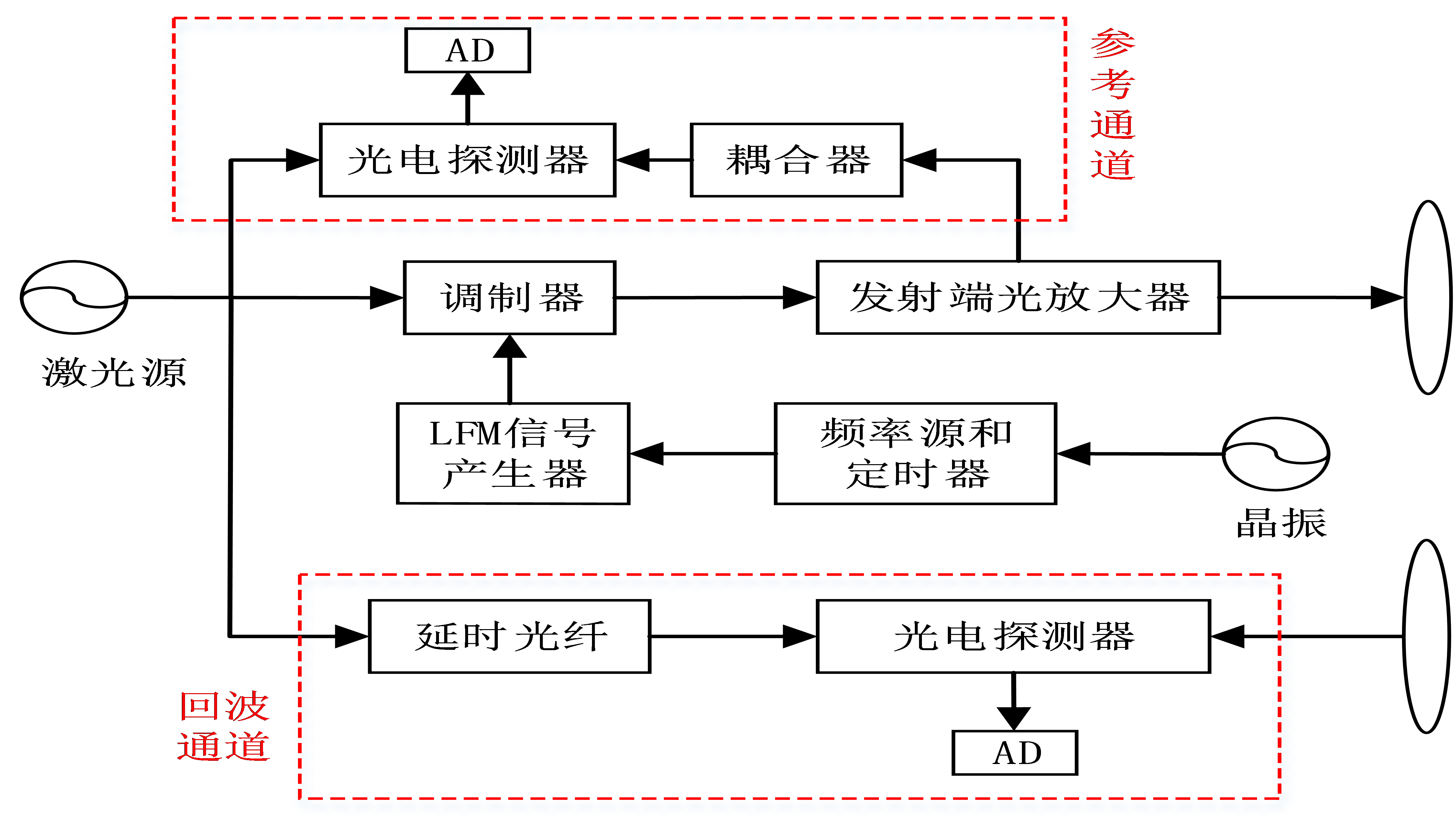 設(shè)置發(fā)射信號(hào)參考通道對(duì)其非線性失真相位實(shí)施定標(biāo)校正,以及通過(guò)本振延時(shí)光纖實(shí)現(xiàn)信號(hào)相干性保持方法如圖2所示。